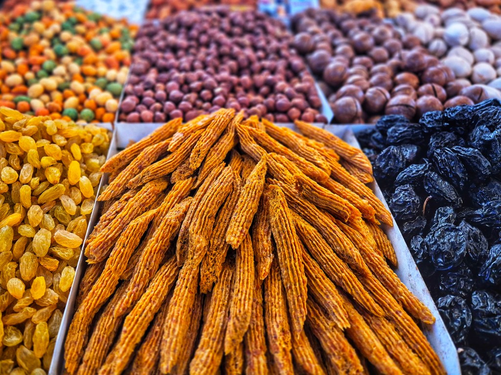 Dried persimmons from China, candied apricots from Afghanistan, camel dairy products, horse meat, the same spices that nations have gone to war for, and teas that have coursed through the veins of the famed routes for centuries, fresh pomegranate juice stands overflowing with incomparable fuchsia… It’s all there!