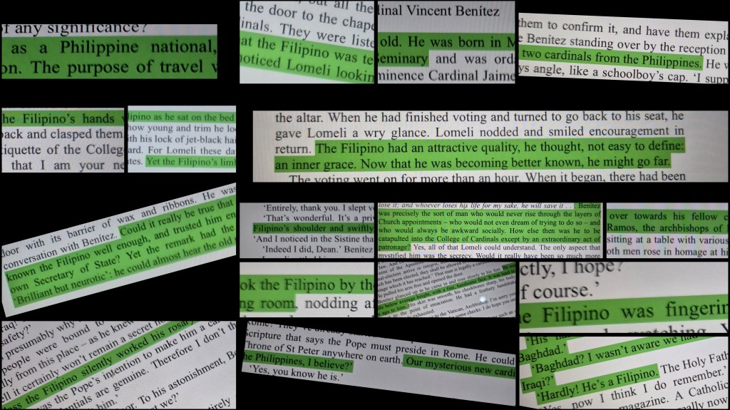 …and yes, Cardinal Benitez is undoubtedly Filipino in the novel; and predominantly Roman Catholic Philippines is at a loss as to whether they are relieved or not that the filmmakers made him Mexican. I, for one, would have preferred the Benitez in the film to be Filipino.