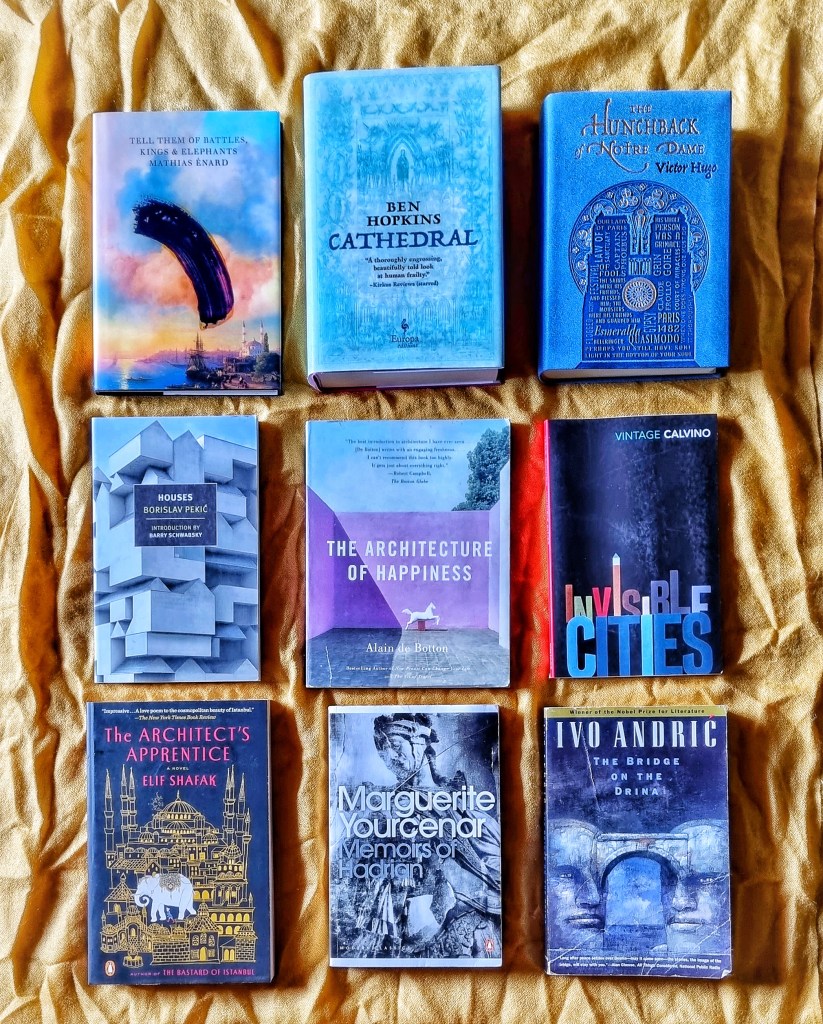Although, through the years, I have come across books in which literature and architecture occupy the same space, and it is nothing short of fascinating when they do: Victor Hugo’s Hunchback of Notre Dame, Italo Calvino’s Invisible Cities, Marguerite Yourcenar’s Memoirs of Hadrian, Boris Pekić’s Houses, Ivo Andrić’s Bridge on the Drina, Alain de Botton’s Architecture of Happiness, Gaston Bachelard’s Poetics of Space, Mathias Énard’s Tell Them of Battles, Kings & Elephants, Elif Shafak’s Architect’s Apprentice, and my current read, Ben Hopkins’ Cathedral. And as we can see, when these two meet, sumptuous covers are a given.