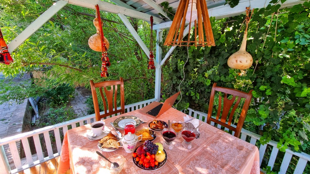 But today I walked into a poem. I found myself welcomed to a courtyard with a garden framed in abundant grapevines. My wonder must have been apparent that the owner of the guest house started pointing at each fruit-bearing tree and incanted, “Fig, apricot, orange, apple, quince, plum, persimmon, pear, peach, walnut, cherry, mulberry…”